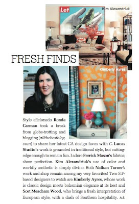 I was thrilled when Andrea Stanford at C Magazine asked me to name a couple of my current California design favorites for the March issue (NO EASY TASK). A few that I have my eye on right now are Kimberly Ayers, Kim Alexandriuk, Ferrick Mason, Lucas Studio and fellow blogger Scot Meacham Wood. Of course, Nathan Turner is always a favorite!
